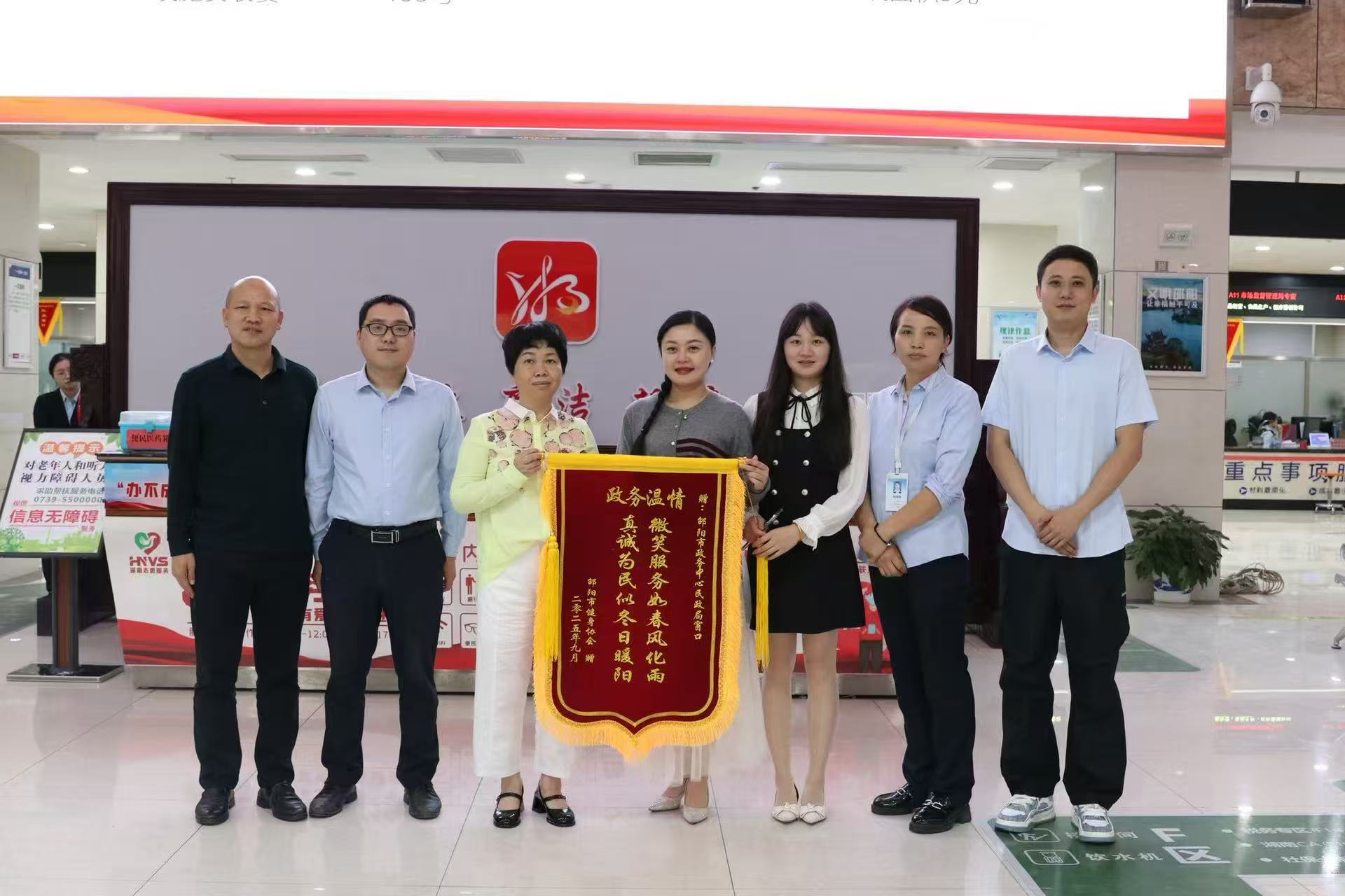近日,市健身协会筹备组代表将一面印着“微笑服务如春风化雨 真诚为民似冬日暖阳”的锦旗,专程送到市政务服务中心民政窗口,以真挚行动向窗口工作人员致谢——感谢其在协会成立登记全流程中提供的细致帮扶与高效服务,更点赞民政部门以优质服务优化社会组织发展营商环境的务实举措。